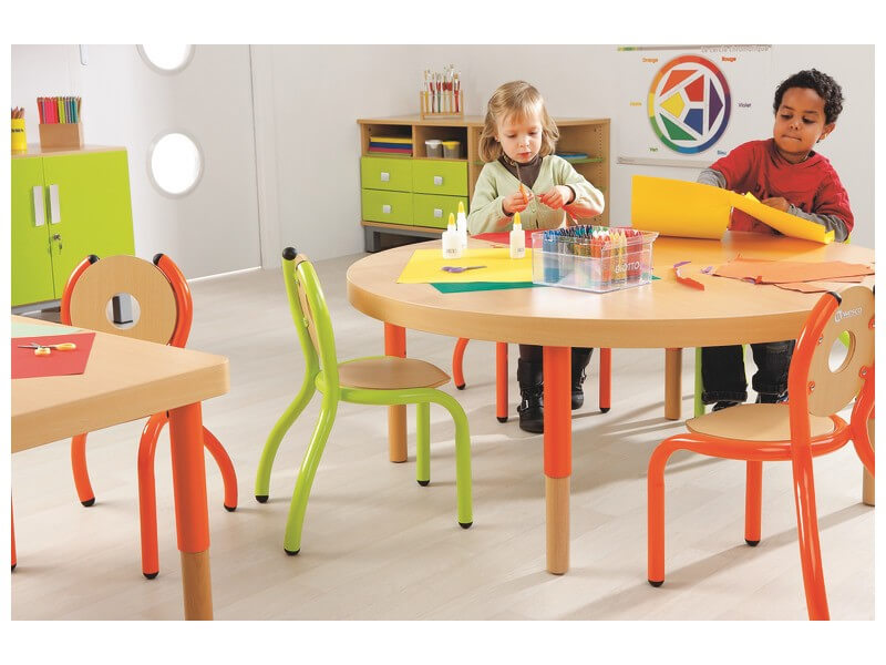 Die runde Tischplatte mit einem Durchmesser von 120 cm bietet großzügig Platz für Gruppenarbeiten, Projekte und kreative Aktivitäten. Kinder können hier gemeinsam lernen, Ideen austauschen und spielerisch zusammenarbeiten. Die Größe des Tisches fördert den Dialog und schafft Raum für gemeinschaftliches Arbeiten.