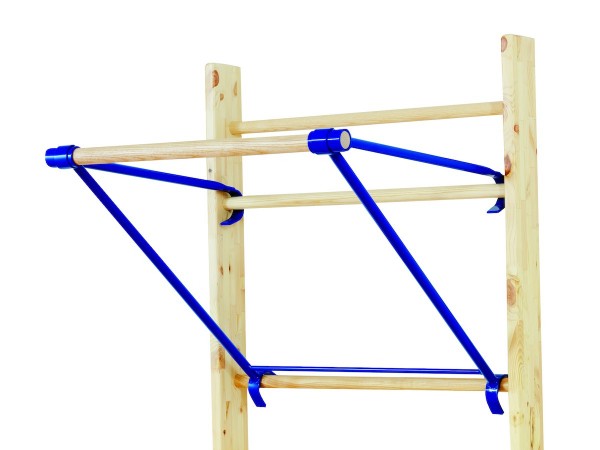 Die Klimmzugstange ist DAS Sprossenwandzubehör, wenn es darum geht, Muskeln aufzubauen und Fit zu bleiben. Die aufklappbare Klimmzugstange ist Ruck-Zuck an der Sprossenwand mit runden oder ovalen Sprossen befestigt, sodass dem Workout nichts mehr im Weg steht. Mit Klimmzügen trainieren Sie nicht nur verschiedene Muskelgruppen des Rückens, sondern auch Armmuskeln. Hier wird vor allem der Bizeps gleich muttrainiert. Weitere Infos hier: (Externer Link) Die Klimmzugstange ist eine stabile Metallkonstruktion in blau mit einer Sprosse aus Esche-Hartholz. Sie ist in der Breite 70 cm oder 90 cm bestellbar.