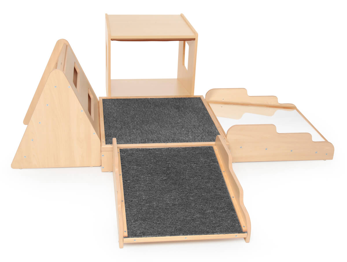 - Inhalt: 5 Podeste mit unterschiedlichen Funktionen (Spiegel, Kletterwand, Tunnel, Gerade Ebene, Schräge Ebene)