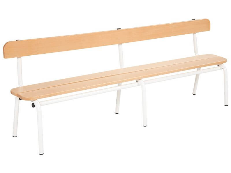 Die hochwertige Umkleidebank ist wahlweise in drei Längen und drei Hohen verfügbar. Dank der Rückenlehne sitzen die Kinder hier stets bequem und entspannt. Die Sitzfläche und die Rückenlehne bestehen aus 2 cm starkem Massivholz. Dank der stabilen Metallkonstruktion steht die Bank sehr sicher und passt zudem durch den Materialmix aus Metall und Holz zu jeder Einrichtung. Die Umkleidebank wird teilmontiert geliefert, nur die Rückenlehne muss lediglich befestigt werden.